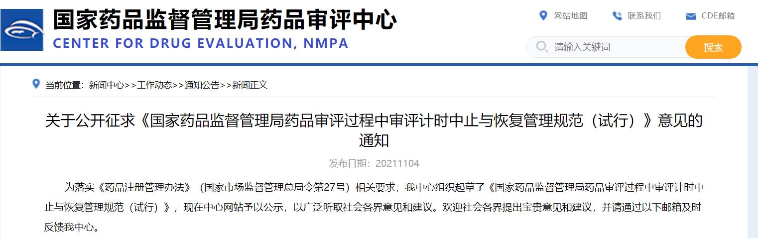 關(guān)于公開(kāi)征求《國(guó)家藥品監(jiān)督管理局藥品審評(píng)過(guò)程中審評(píng)計(jì)時(shí)中止與恢復(fù)管理規(guī)范(試行)》意見(jiàn)的通知