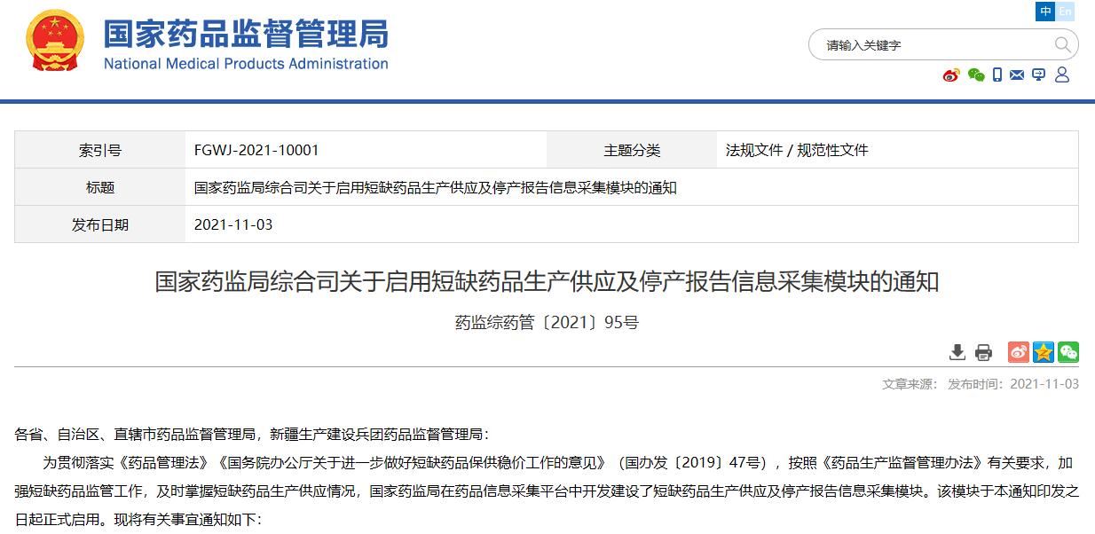 國(guó)家藥監(jiān)局綜合司關(guān)于啟用短缺藥品生產(chǎn)供應(yīng)及停產(chǎn)報(bào)告信息采集模塊的通知