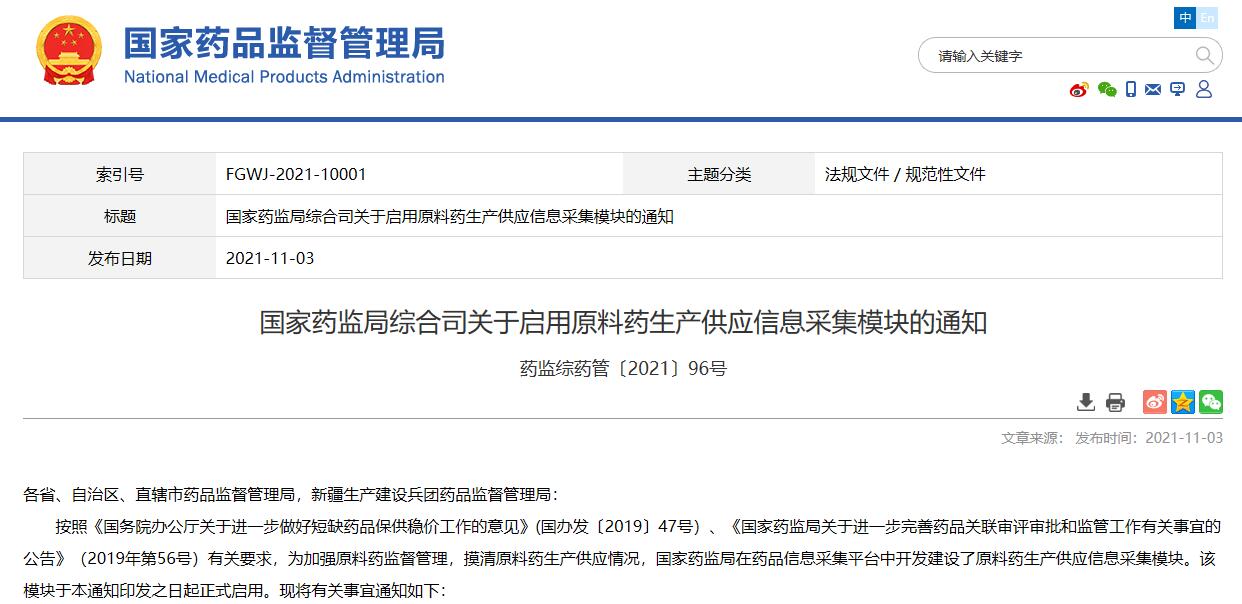 國(guó)家藥監(jiān)局綜合司關(guān)于啟用原料藥生產(chǎn)供應(yīng)信息采集模塊的通知