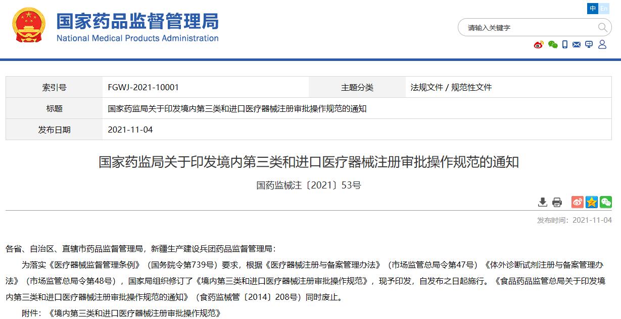 國(guó)家藥監(jiān)局關(guān)于印發(fā)境內(nèi)第三類和進(jìn)口醫(yī)療器械注冊(cè)審批操作規(guī)范的通知