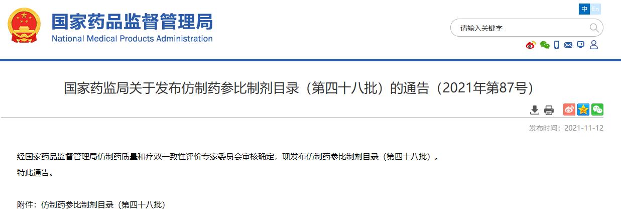 國(guó)家藥監(jiān)局關(guān)于發(fā)布仿制藥參比制劑目錄(第四十八批)的通告(2021年第87號(hào))