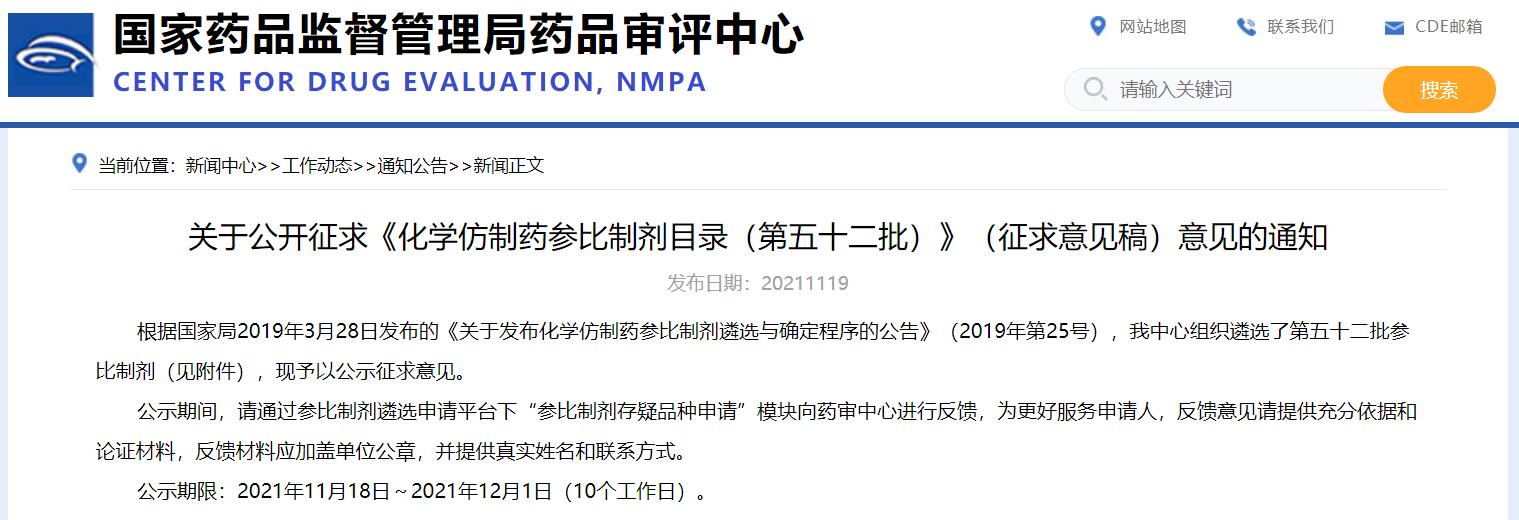 關(guān)于公開征求《化學(xué)仿制藥參比制劑目錄(第五十二批)》(征求意見稿)意見的通知