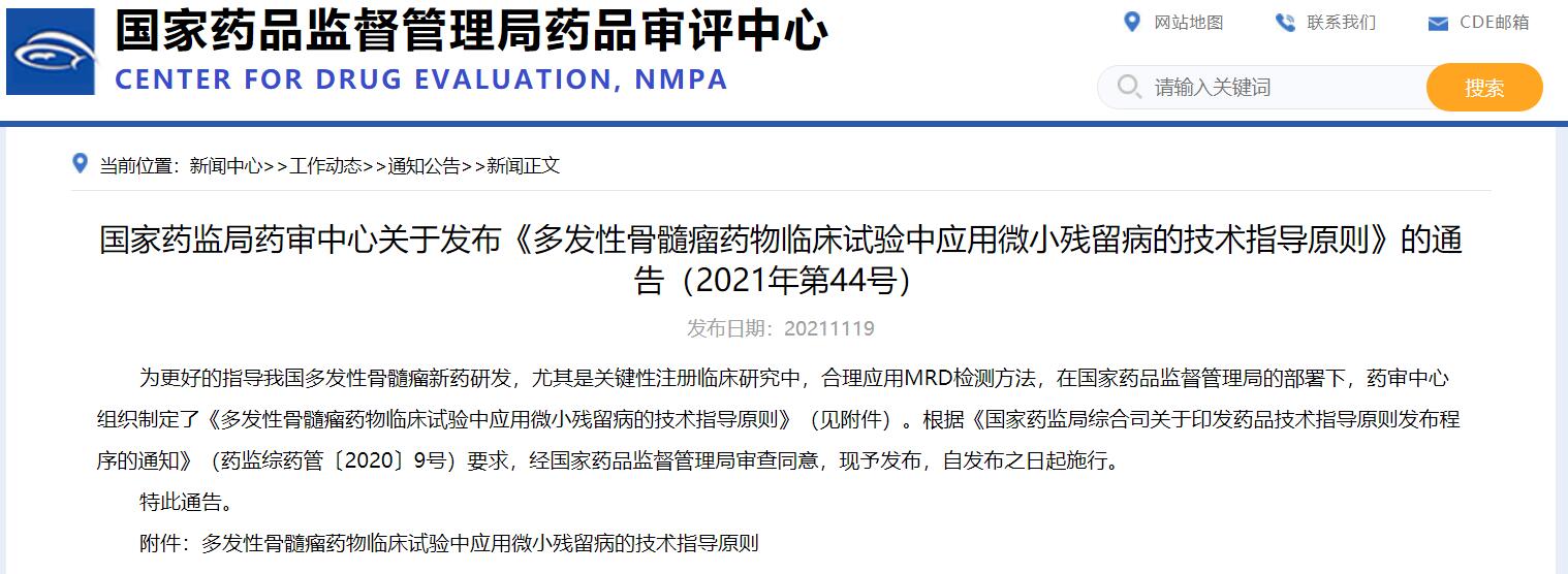 國家藥監(jiān)局藥審中心關(guān)于發(fā)布《多發(fā)性骨髓瘤藥物臨床試驗中應(yīng)用微小殘留病的技術(shù)指導(dǎo)原則》的通告(2021年第44號)