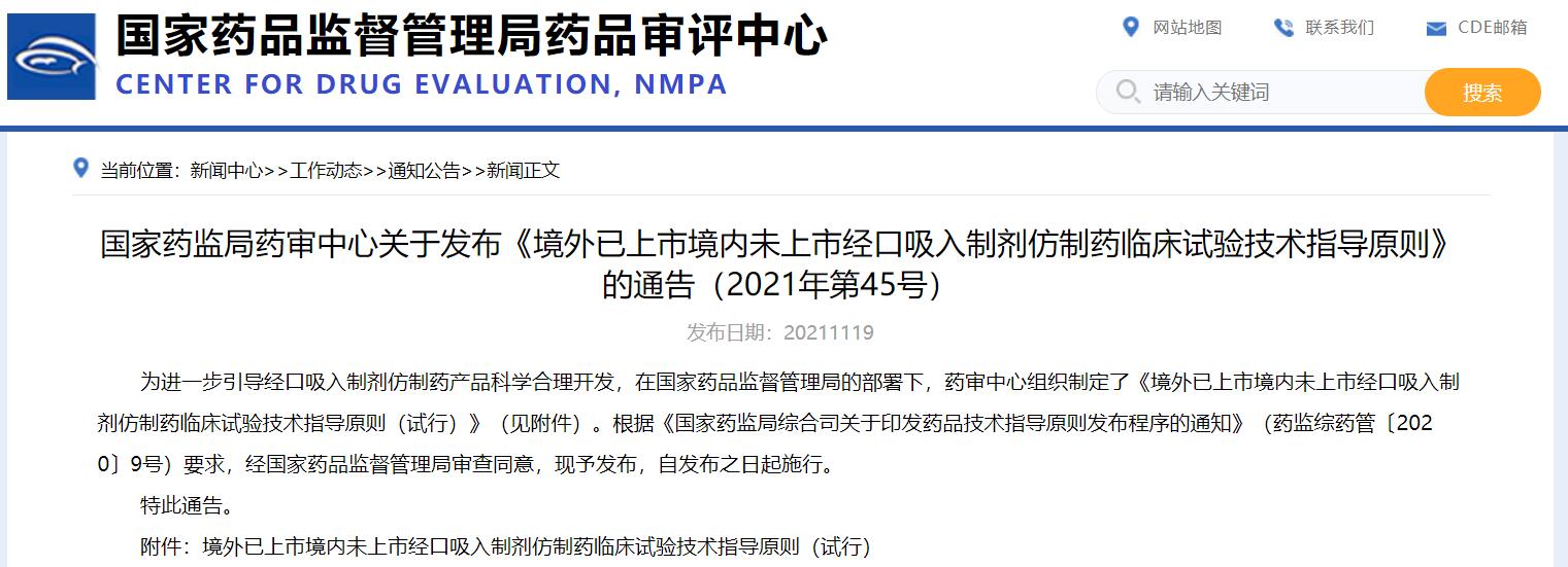 國家藥監(jiān)局藥審中心關(guān)于發(fā)布《境外已上市境內(nèi)未上市經(jīng)口吸入制劑仿制藥臨床試驗技術(shù)指導(dǎo)原則》的通告(2021年第45號)