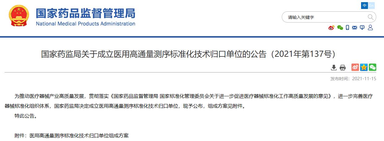 國家藥監(jiān)局關(guān)于成立醫(yī)用高通量測序標(biāo)準(zhǔn)化技術(shù)歸口單位的公告(2021年第137號)