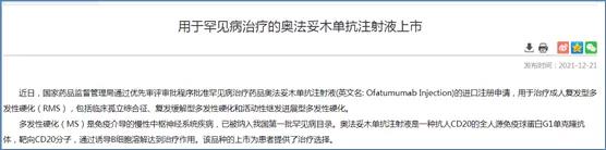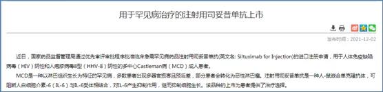 2021年,CDE發(fā)布兩則關于罕見病用藥的臨床研發(fā)指導原則,通過優(yōu)先審評審批方式批準2款罕見病用藥,分別為奧法妥木單抗注射液(用于治療成人復發(fā)型多發(fā)性硬化(RMS)) 和注射用司妥昔單抗(用于人體免疫缺陷病毒(HIV)陰性和人皰疹病毒8型(HHV-8)陰性的多中心Castleman病(MCD)成人患者)。