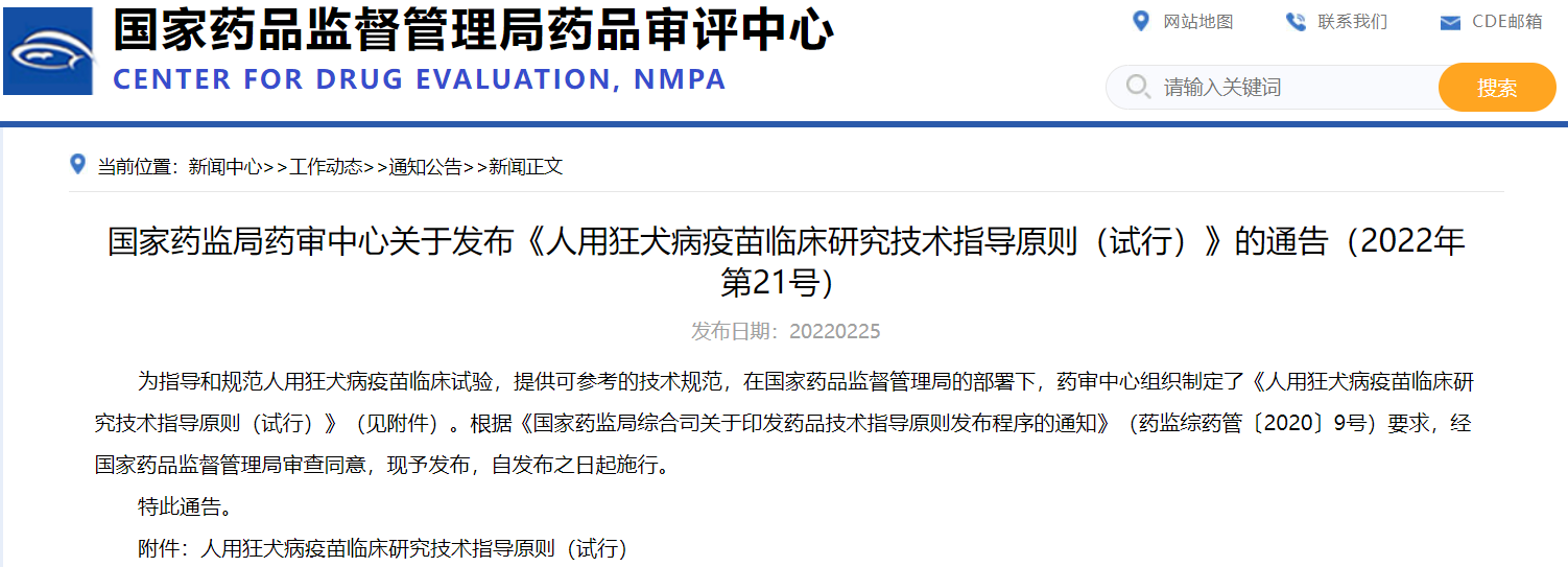 國家藥監(jiān)局藥審中心關于發(fā)布《人用狂犬病疫苗臨床研究技術指導原則(試行)》的通告(2022年第21號)