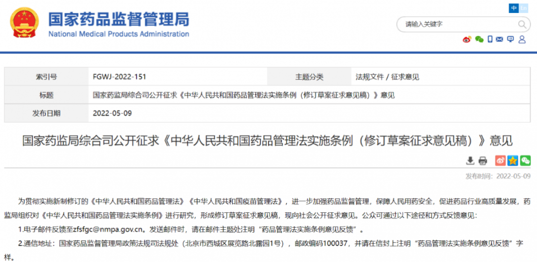 政策法規(guī)||中華人民共和國藥品管理法實施條例(修訂草案征求意見稿)(附本周法規(guī)概覽05.09-05.13)