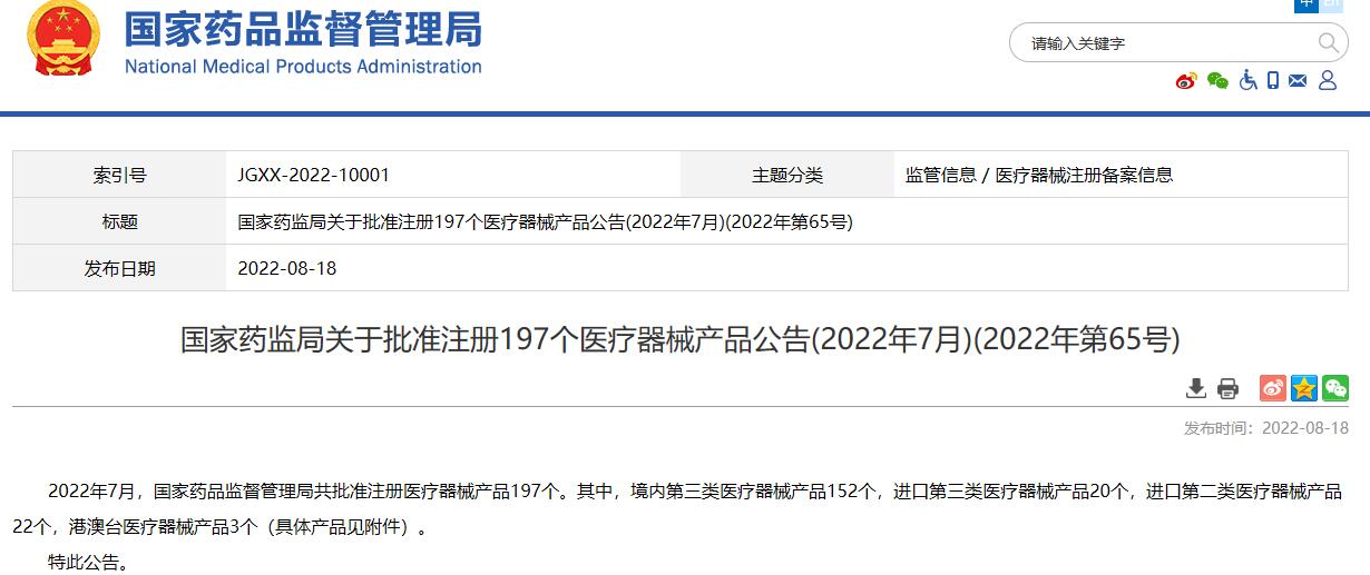 國家藥監(jiān)局關(guān)于批準注冊197個醫(yī)療器械產(chǎn)品公告(2022年7月)(2022年第65號)