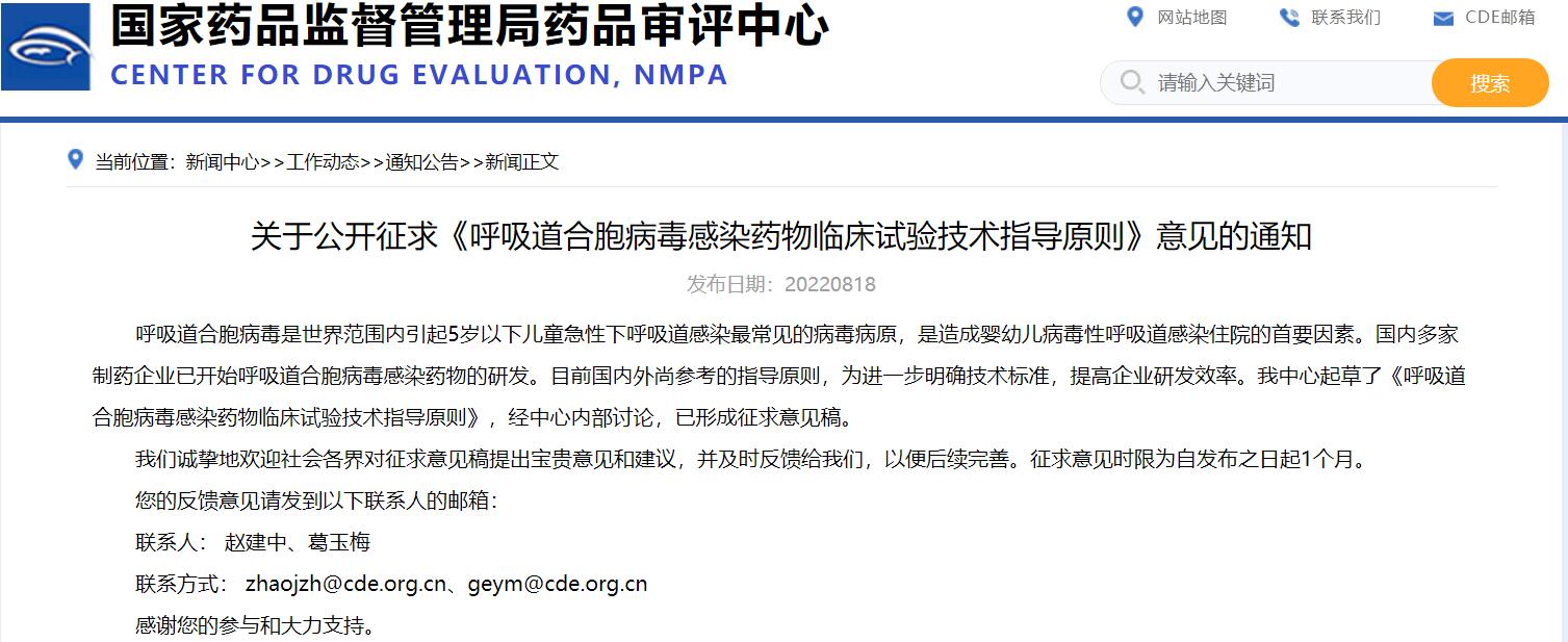 關(guān)于公開征求《呼吸道合胞病毒感染藥物臨床試驗技術(shù)指導(dǎo)原則》意見的通知