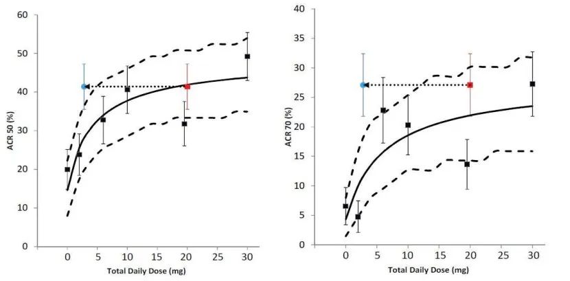 本品種PD研究中以美國風(fēng)濕病學(xué)會(huì)(ACR)規(guī)定觀指標(biāo),若患者達(dá)到20%、50%或70%的緩解,即達(dá)到ACR20、ACR50或ACR70緩解。