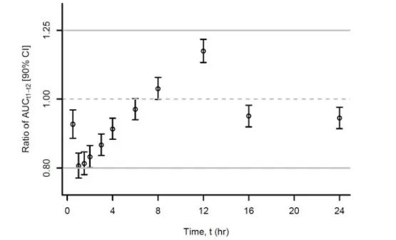 除此之外,該試驗(yàn)中也分析了不同時(shí)間段,兩種制劑藥動(dòng)學(xué)的差異,如圖所示: