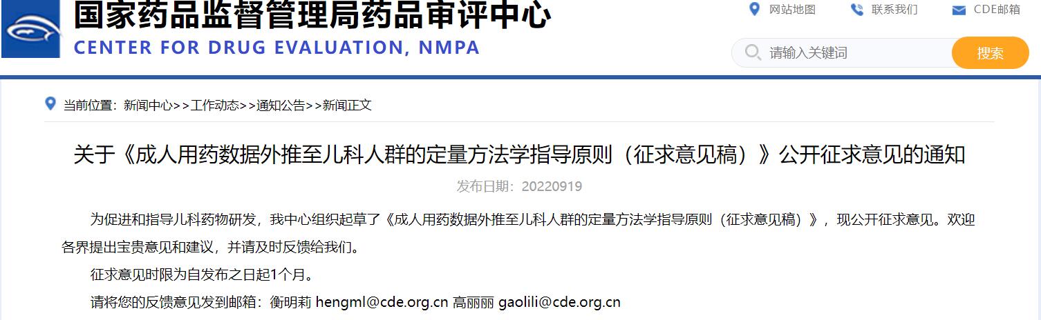關(guān)于《成人用藥數(shù)據(jù)外推至兒科人群的定量方法學(xué)指導(dǎo)原則(征求意見(jiàn)稿)》公開(kāi)征求意見(jiàn)的通知