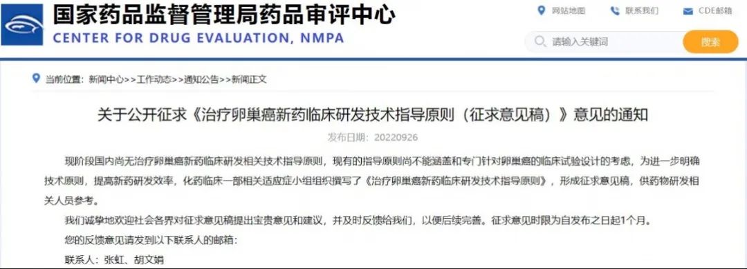 關(guān)于公開征求《治療卵巢癌新藥臨床研發(fā)技術(shù)指導(dǎo)原則(征求意見稿)》意見的通知