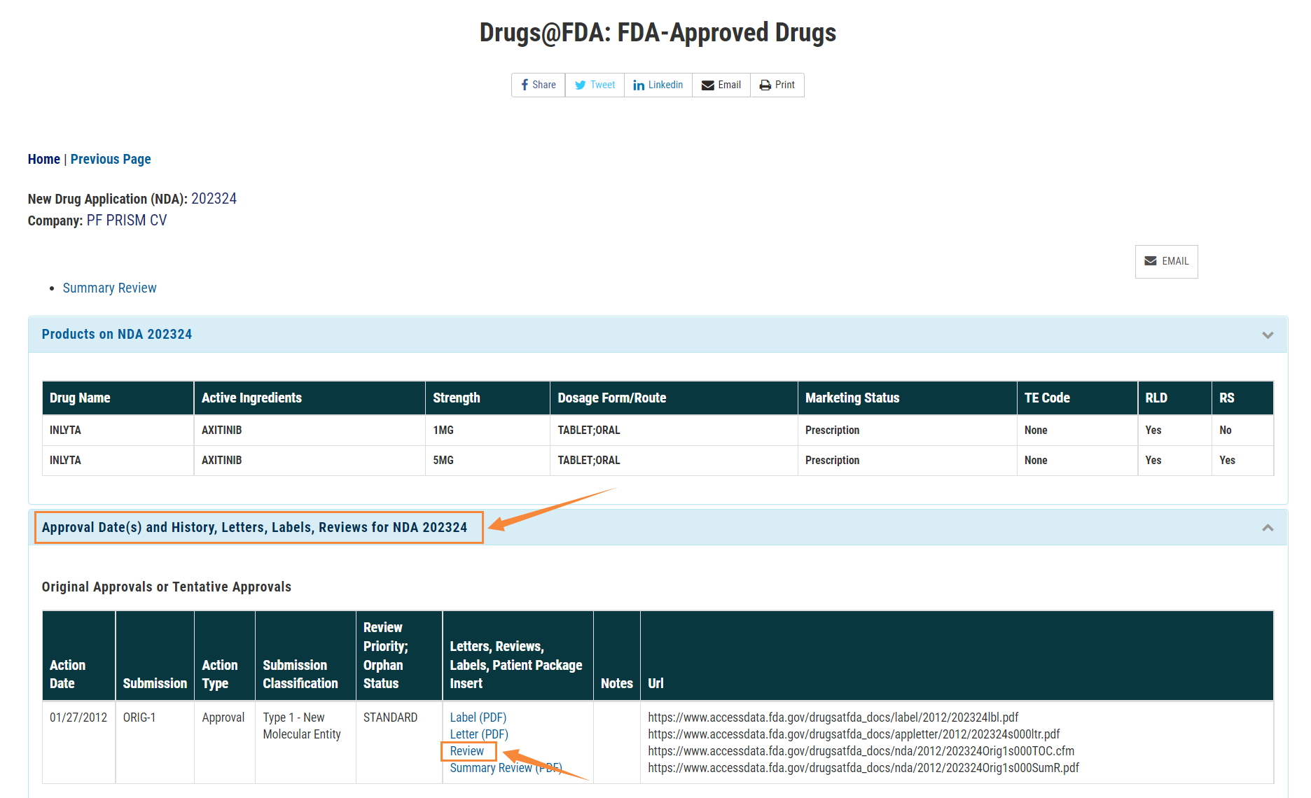 - 進入”Drug Details”,看到藥品詳細信息,點擊”Approval Date(s) and History, Letters, Labels, Reviews for NDA 202324”,在菜單欄目選擇“Review”,即可看到相應的審評報告