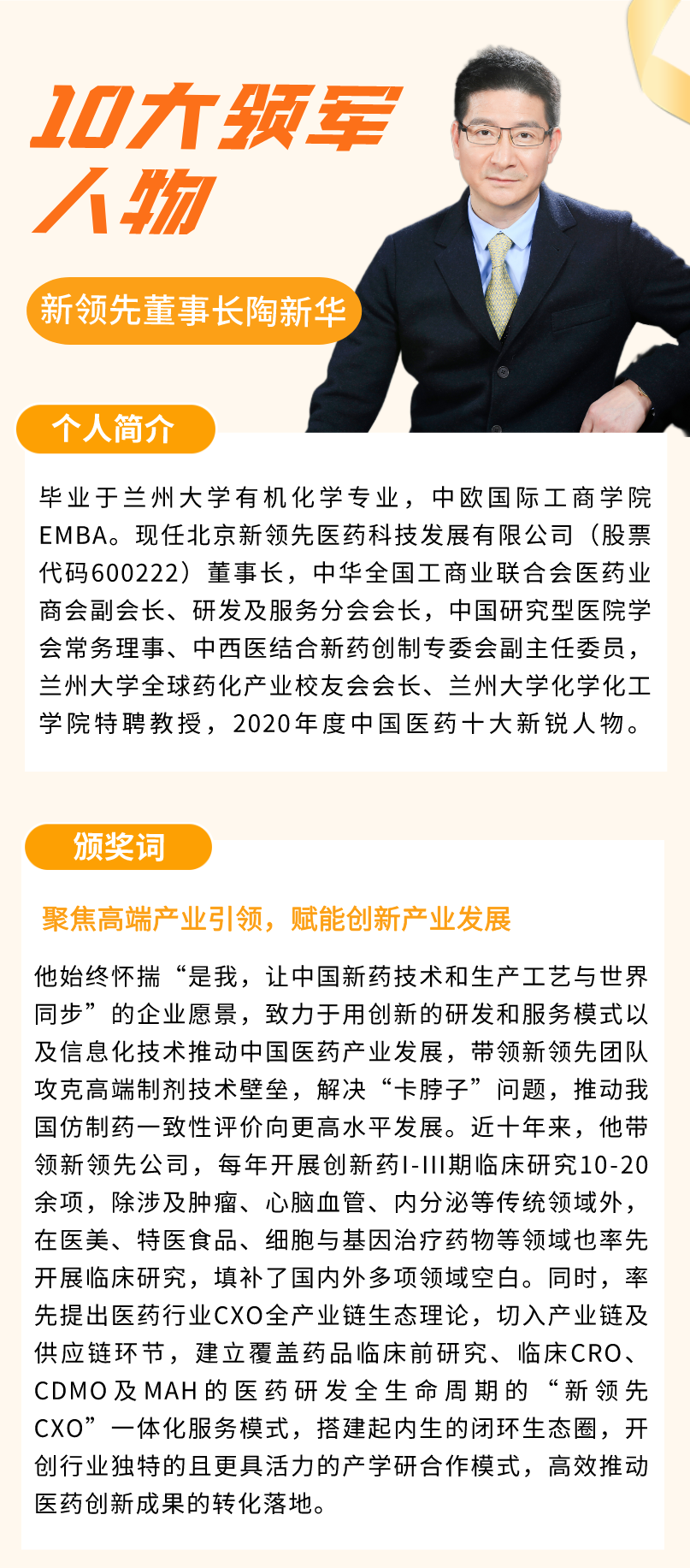 “此次,能與揚子江藥業(yè)徐浩宇董事長、石藥集團(tuán)蔡東晨董事長、邁瑞生物李西廷董事長等優(yōu)秀的企業(yè)家一起成為10大領(lǐng)軍人物,深感榮幸,同時,也是行業(yè)對新領(lǐng)先CXO全產(chǎn)業(yè)鏈服務(wù)模式的認(rèn)可。新藥的研發(fā)是基于滿足未被滿足的臨床需要,同時實現(xiàn)商業(yè)轉(zhuǎn)化,產(chǎn)生商業(yè)價值,否則便不是真正的新藥。新領(lǐng)先CXO模式可以幫助研發(fā)企業(yè)以終為始,通過頂層設(shè)計,閉環(huán)快速地完成目標(biāo),節(jié)省社會資源,倍增社會價值。未來新領(lǐng)先將繼續(xù)致力于用創(chuàng)新的研發(fā)和服務(wù)模式,與醫(yī)藥業(yè)同仁一起創(chuàng)造開放的積木式研發(fā)生態(tài)”陶新華董事長在采訪中表示。