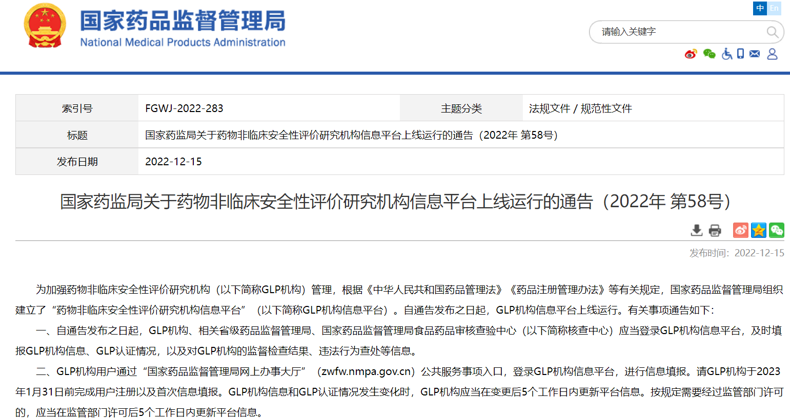 國家藥監(jiān)局關(guān)于藥物非臨床安全性評價研究機構(gòu)信息平臺上線運行的通告(2022年 第58號)