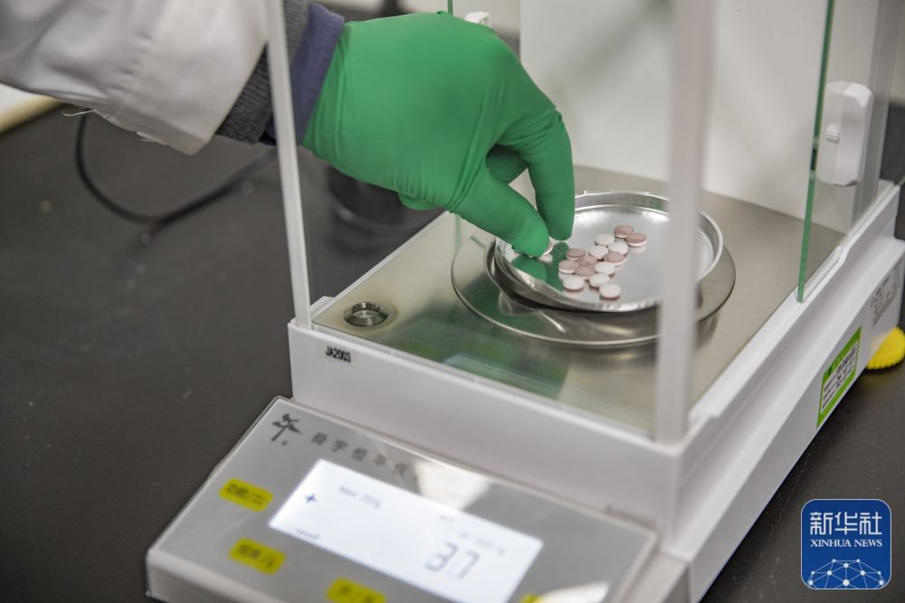 12月16日,在重慶市永川區(qū)新領(lǐng)先(重慶)生物醫(yī)藥一體化研發(fā)服務(wù)基地,新領(lǐng)先重慶研究院的研發(fā)人員對(duì)雙重壓片機(jī)壓制的實(shí)驗(yàn)藥品進(jìn)行稱重查驗(yàn)。