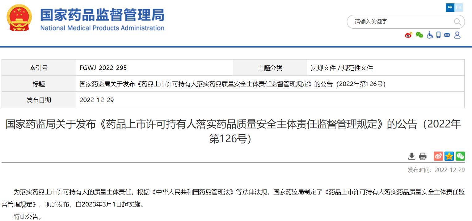 國家藥監(jiān)局關(guān)于發(fā)布《藥品上市許可持有人落實藥品質(zhì)量安全主體責(zé)任監(jiān)督管理規(guī)定》的公告(2022年第126號)