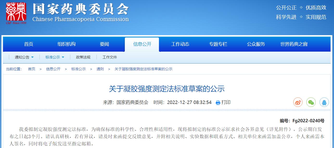 國家藥典委發(fā)布凝膠強度測定法標(biāo)準(zhǔn)草案的公示。