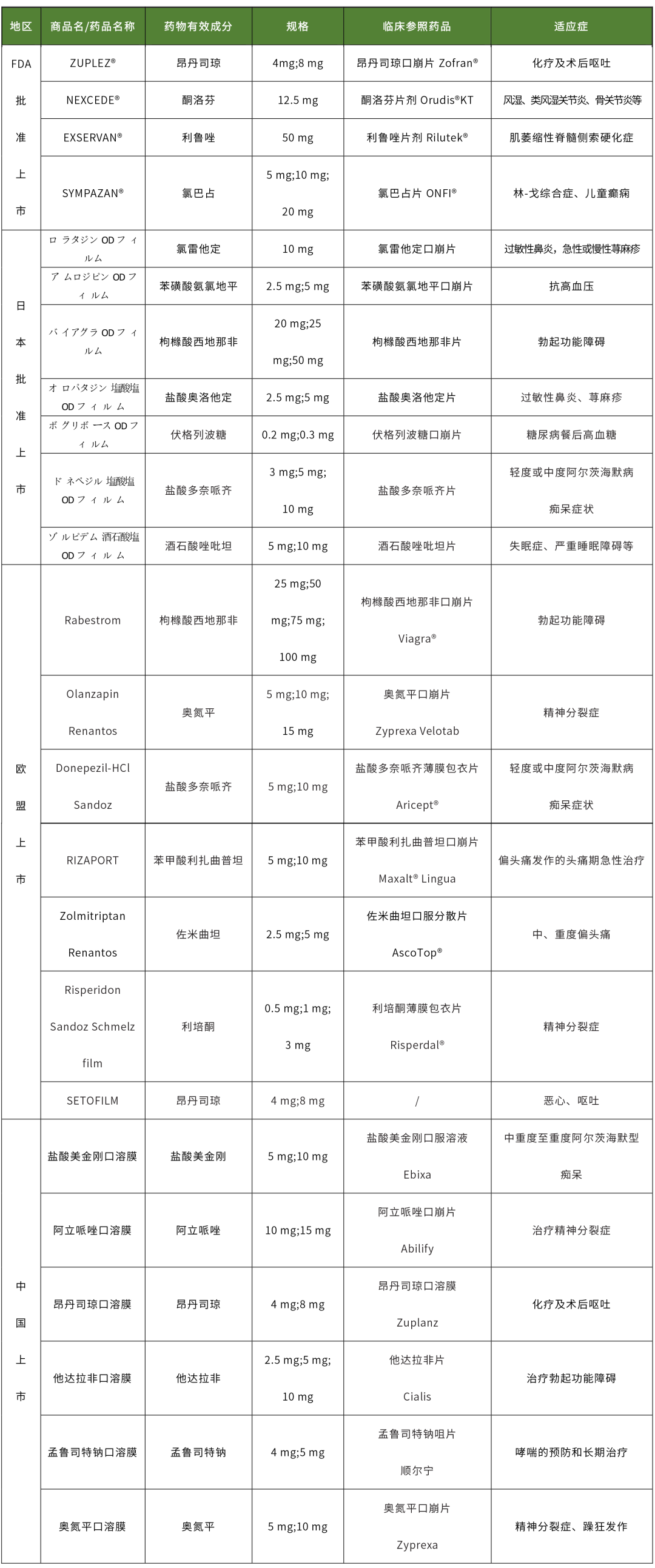 口溶膜作為一種新型口服藥物遞送劑型,具有可在口腔中迅速崩解,厚度薄,重量輕,耐折抗拉,攜帶方便,劑量準(zhǔn)確等優(yōu)點(diǎn),可克服口腔崩解片易碎、抗折性差及口服液體制劑劑量控制差的缺點(diǎn),有效的解決特殊患者如兒童、老人、精神病患者等服用藥物順應(yīng)性差的問題,因此受到了廣泛關(guān)注,是制藥企業(yè)選擇改良創(chuàng)新藥物研究的熱點(diǎn)劑型。