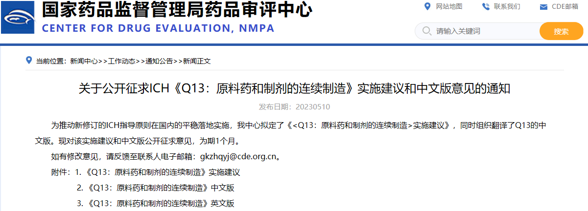 關(guān)于公開(kāi)征求ICH《Q13:原料藥和制劑的連續(xù)制造》實(shí)施建議和中文版意見(jiàn)的通知