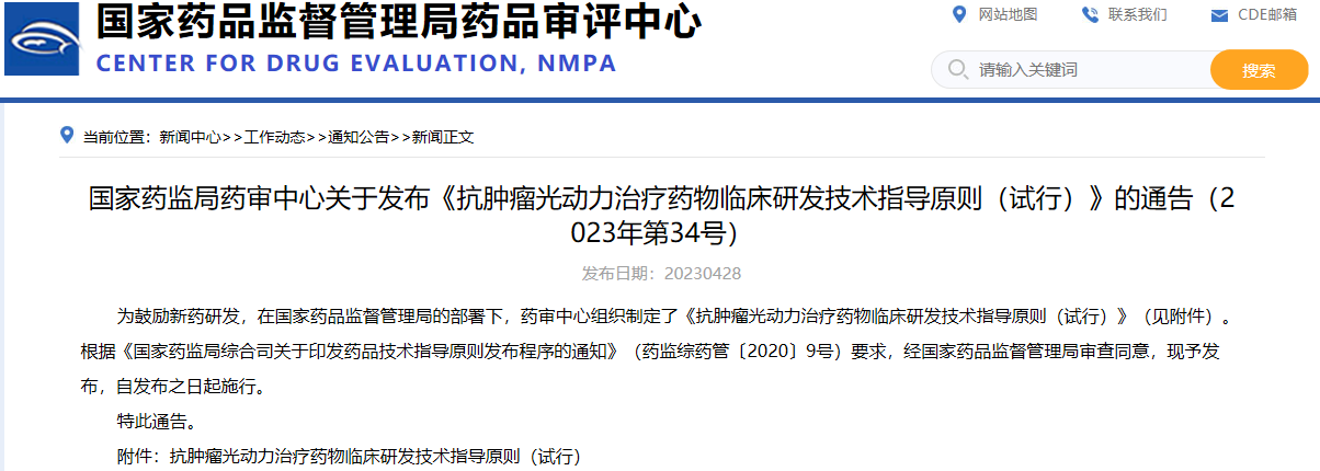 國(guó)家藥監(jiān)局藥審中心關(guān)于發(fā)布《抗腫瘤光動(dòng)力治療藥物臨床研發(fā)技術(shù)指導(dǎo)原則(試行)》的通告(2023年第34號(hào))