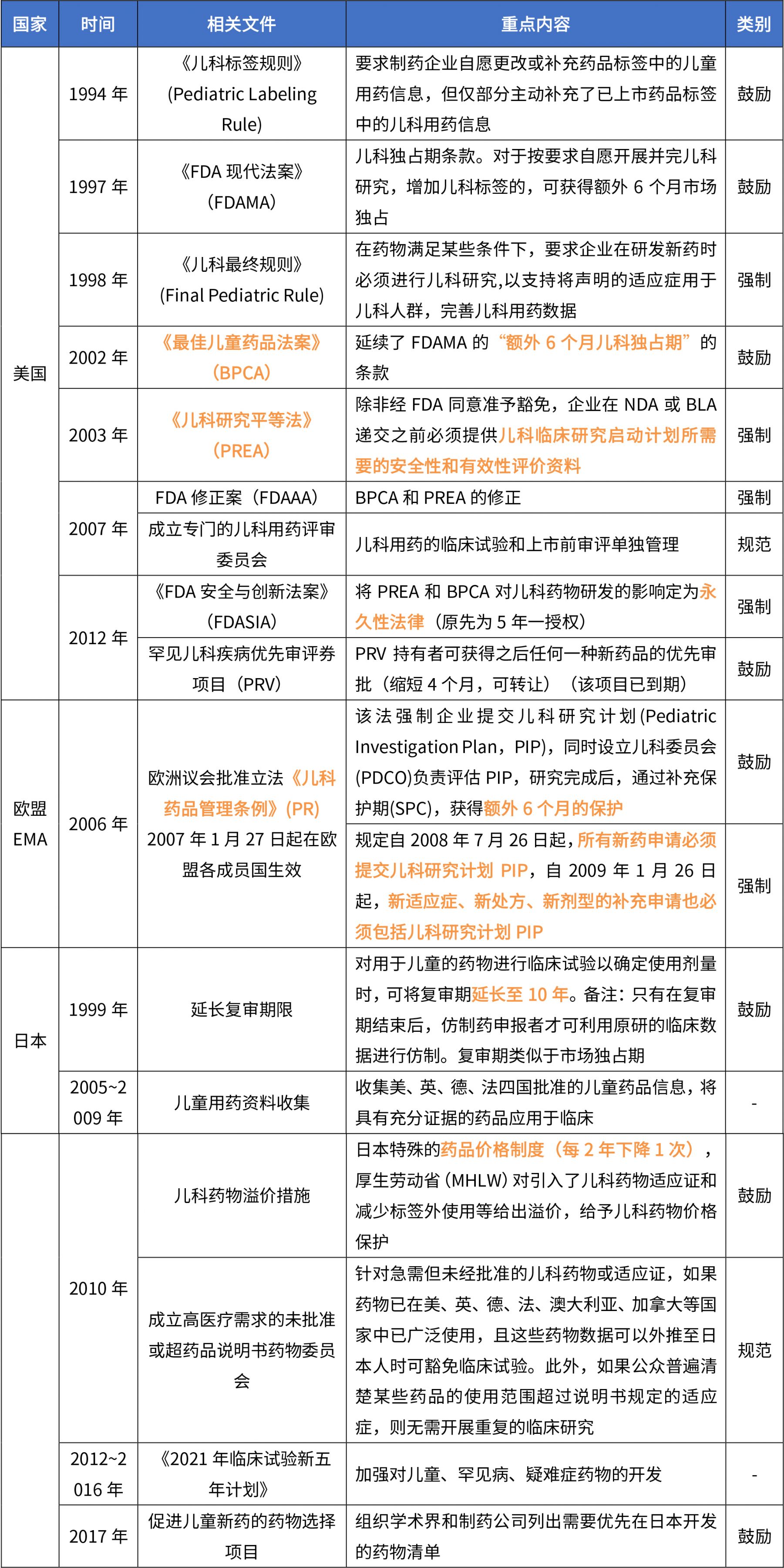 歐美日是兒科用藥政策先行者,美國、歐盟都具有專門的的兒童用藥立法,采用鼓勵+強制結(jié)合的協(xié)同策略促進兒童新藥的開發(fā)、兒童臨床試驗的管理等。日本也通過制定各種法規(guī)來鼓勵規(guī)兒藥開發(fā)。各國項目兒藥法規(guī)內(nèi)容見下表。