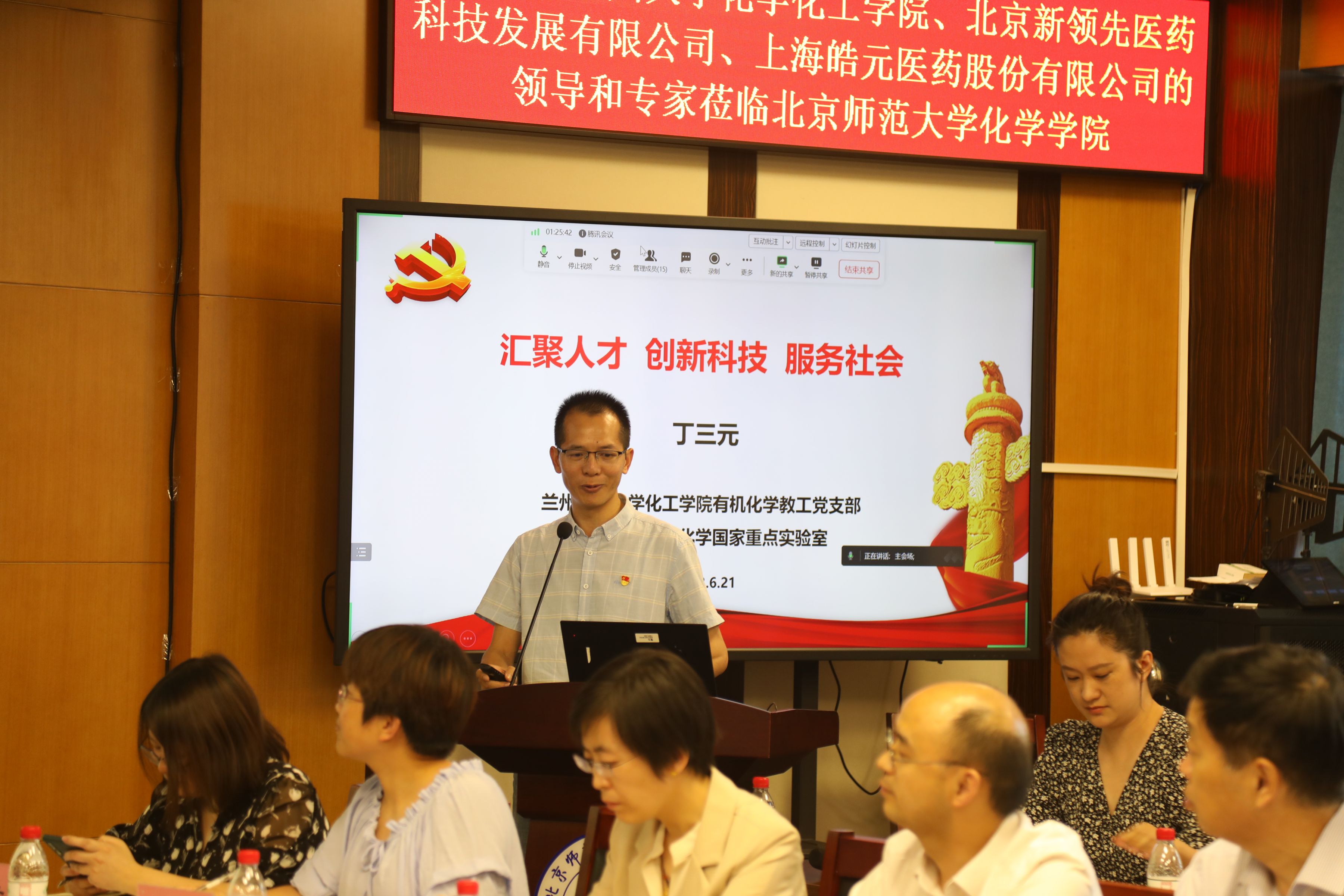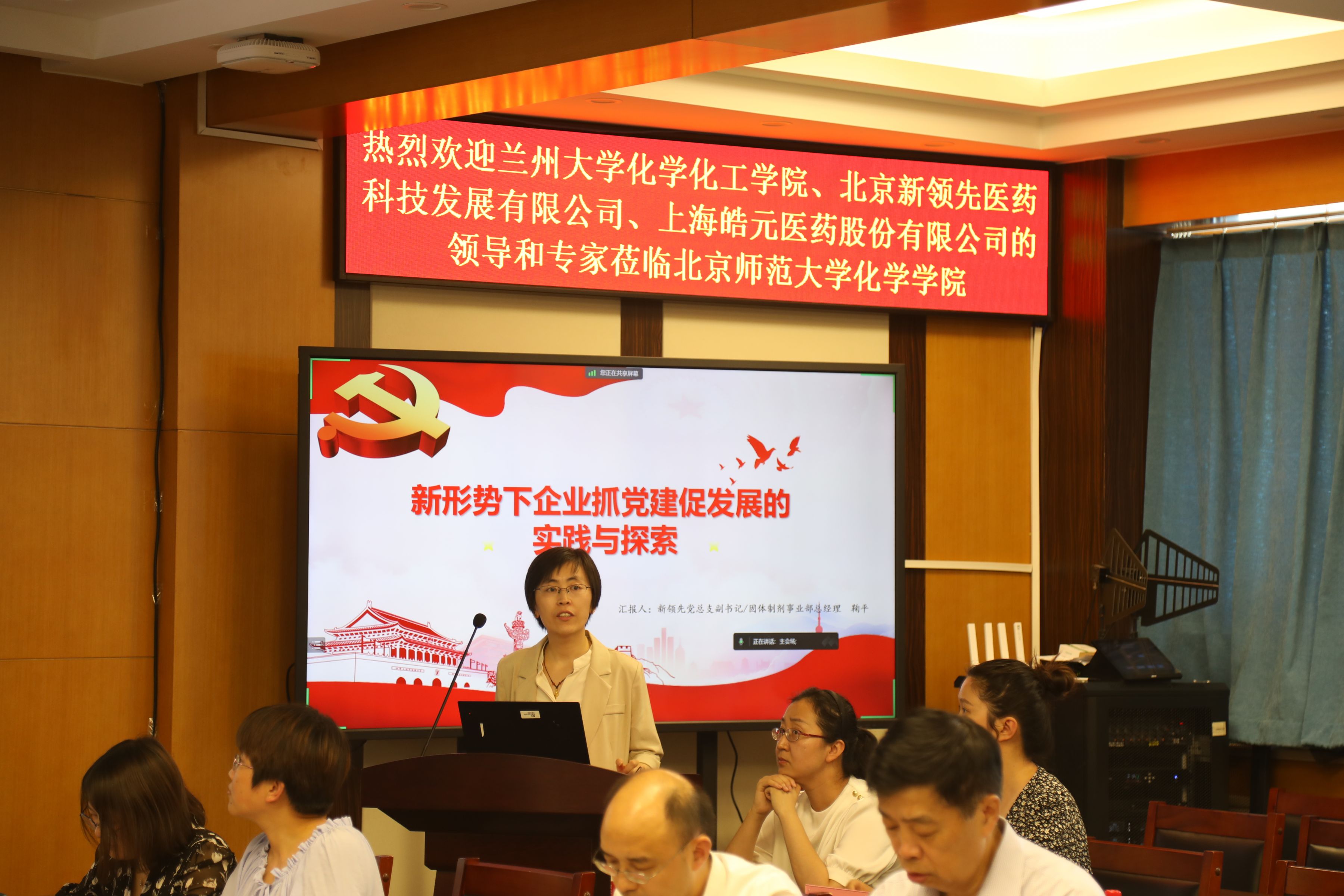 參加本次研討活動的有:北京師范大學化學學院黨委書記盧忠林教授,化學學院院長毛蘭群教授,化學學院黨委副書記韓娟博士,科研院校地合作與科研成果轉(zhuǎn)化處副處長孫根班教授;蘭州大學化學化工學院黨委書記杜生一博士,功能有機分子化學國家重點實驗室主任王為教授(線上);新領先醫(yī)藥黨總支書記、董事長陶新華先生,副總裁顏耀東先生、張翔先生,黨總支副書記、固體制劑事業(yè)部總經(jīng)理鞠平女士,黨總支紀支檢委員、臨床運營部副總監(jiān)杜書青女士;上海皓元產(chǎn)品負責人、樂研首席科學家陳委先生等30余人。