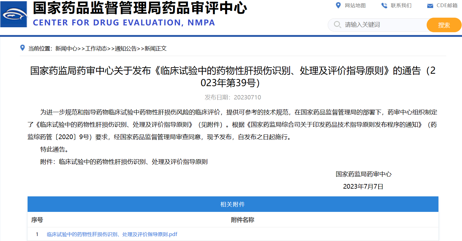 國家藥監(jiān)局藥審中心關(guān)于發(fā)布《臨床試驗中的藥物性肝損傷識別、處理及評價指導(dǎo)原則》的通告(2023年第39號)