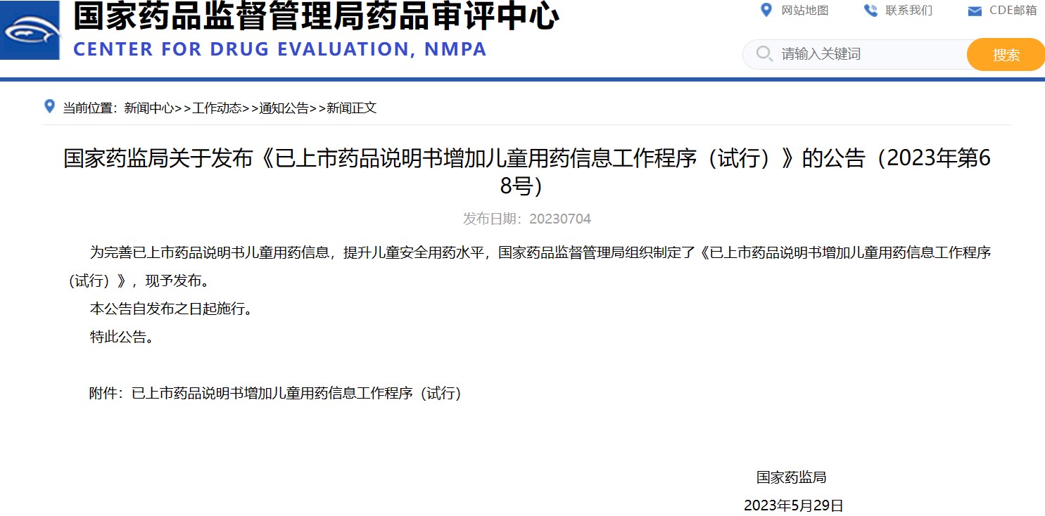國家藥監(jiān)局關(guān)于發(fā)布《已上市藥品說明書增加兒童用藥信息工作程序(試行)》的公告(2023年第68號)