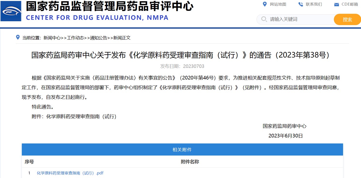 國家藥監(jiān)局藥審中心關(guān)于發(fā)布《化學(xué)原料藥受理審查指南(試行)》的通告(2023年第38號)