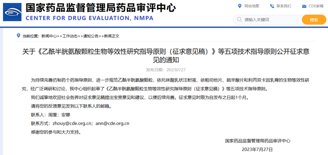 關(guān)于《乙酰半胱氨酸顆粒生物等效性研究指導(dǎo)原則(征求意見稿)》等五項(xiàng)技術(shù)指導(dǎo)原則公開征求意見的通知