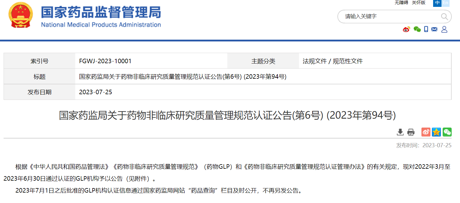 國家藥監(jiān)局關(guān)于藥物非臨床研究質(zhì)量管理規(guī)范認(rèn)證公告(第6號(hào)) (2023年第94號(hào))