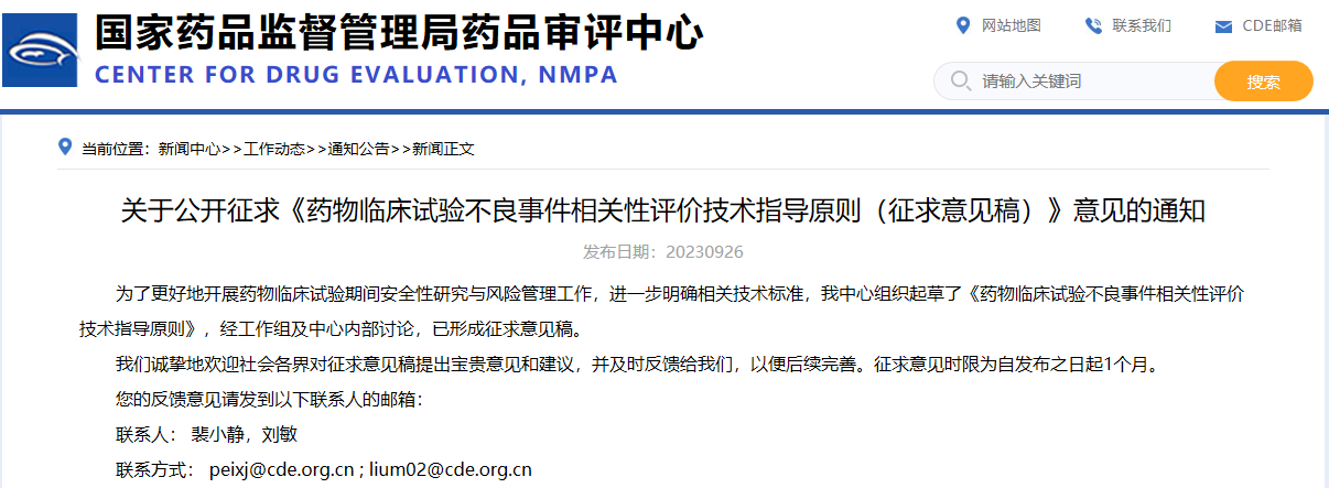 關(guān)于公開征求《藥物臨床試驗(yàn)不良事件相關(guān)性評價(jià)技術(shù)指導(dǎo)原則(征求意見稿)》意見的通知