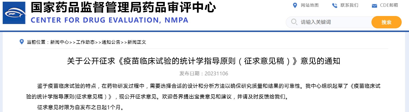 關(guān)于公開征求《疫苗臨床試驗的統(tǒng)計學(xué)指導(dǎo)原則(征求意見稿)》意見的通知