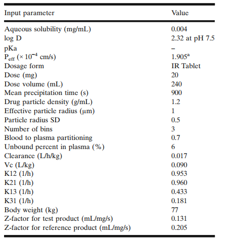 對于預測不同晶型的藥動,需要將不同晶型的數(shù)據(jù)納入至模型中去,如水溶性、FaSSIF和FeSSIF的溶解性和溶出曲線、粒徑等。當然我們也有不知道的數(shù)據(jù),如參比制劑的粒徑的數(shù)據(jù),這些數(shù)據(jù)均有可能會影響藥物在體內(nèi)的吸收,我們決定采用Z-factor模型用于代表不同晶型的體外溶出模型。