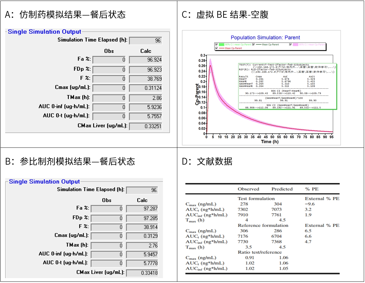 采用上述模型,32例受試者進行虛擬BE試驗,仿制藥和參比制劑的Cmax和AUC均為80.00%-125.00%范圍內(nèi),兩者具有生物等效性。外部驗證的模型PE值小于10%。