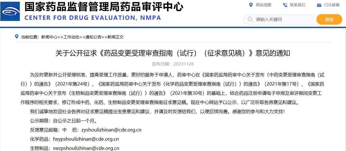關(guān)于公開征求《藥品變更受理審查指南(試行)(征求意見稿)》意見的通知