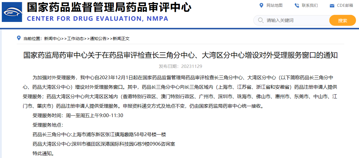 國(guó)家藥監(jiān)局藥審中心關(guān)于在藥品審評(píng)檢查長(zhǎng)三角分中心、大灣區(qū)分中心增設(shè)對(duì)外受理服務(wù)窗口的通知