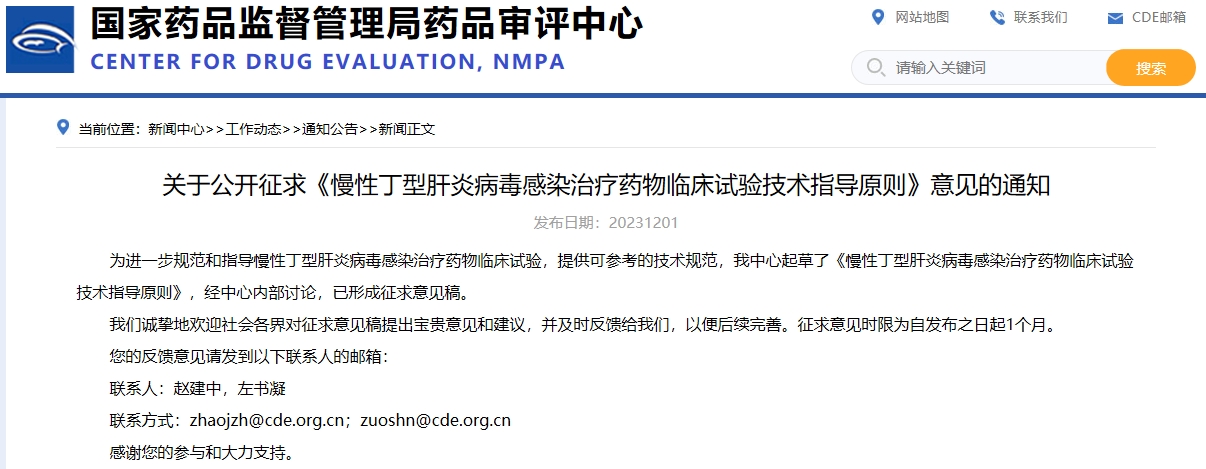 關(guān)于公開征求《慢性丁型肝炎病毒感染治療藥物臨床試驗(yàn)技術(shù)指導(dǎo)原則》意見的通知