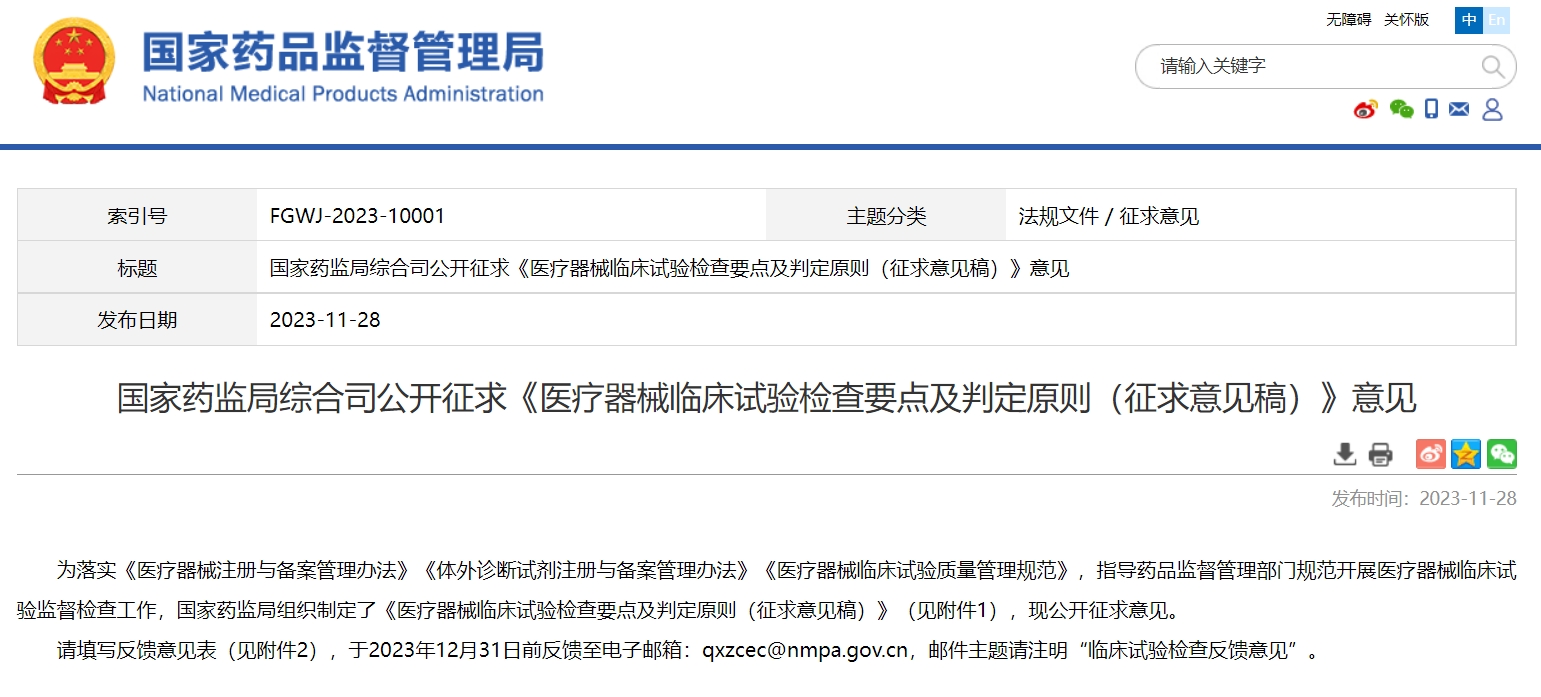 國(guó)家藥監(jiān)局綜合司公開征求《醫(yī)療器械臨床試驗(yàn)檢查要點(diǎn)及判定原則(征求意見稿)》意見
