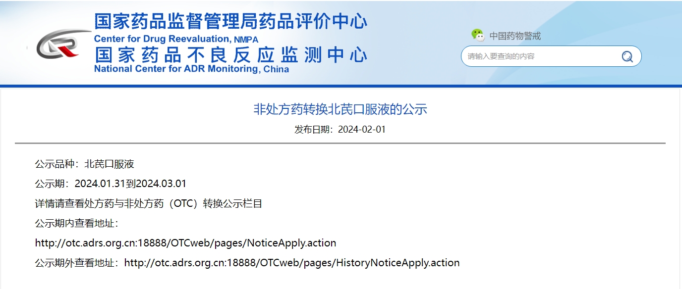 非處方藥轉(zhuǎn)換北芪口服液的公示
