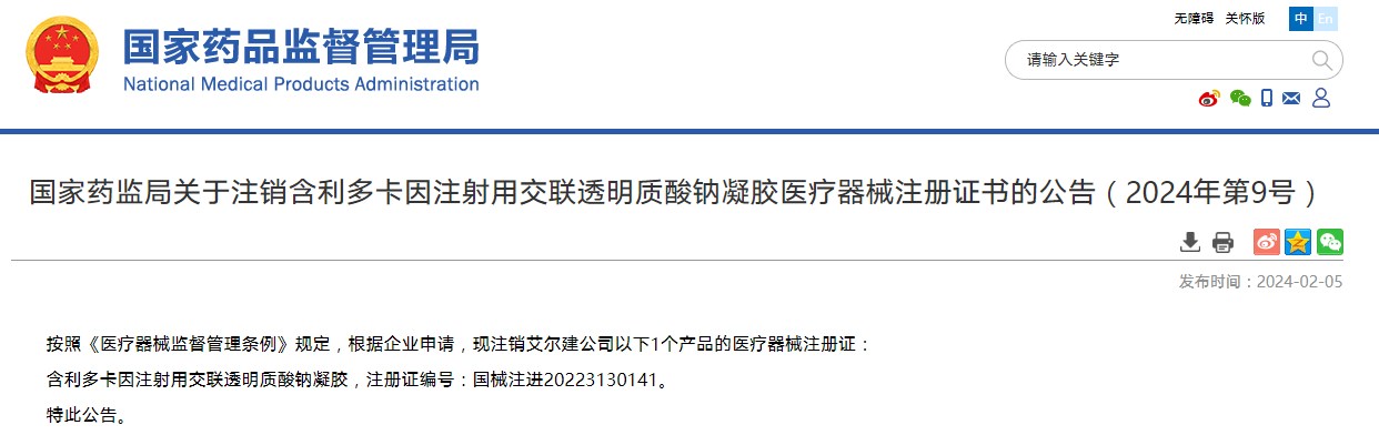 國(guó)家藥監(jiān)局關(guān)于注銷含利多卡因注射用交聯(lián)透明質(zhì)酸鈉凝膠醫(yī)療器械注冊(cè)證書(shū)的公告(2024年第9號(hào))