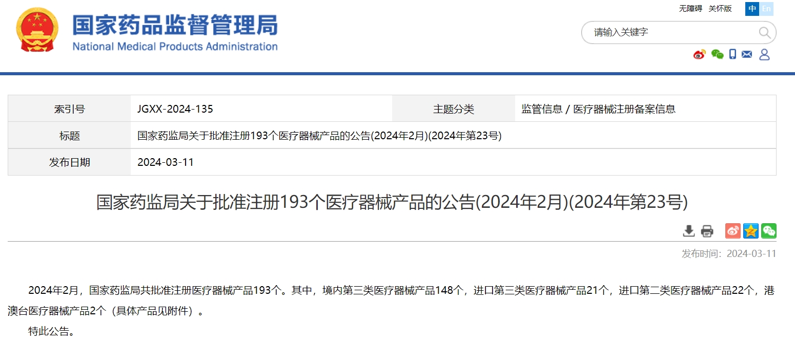 國家藥監(jiān)局關(guān)于批準(zhǔn)注冊(cè)193個(gè)醫(yī)療器械產(chǎn)品的公告(2024年2月)(2024年第23號(hào))