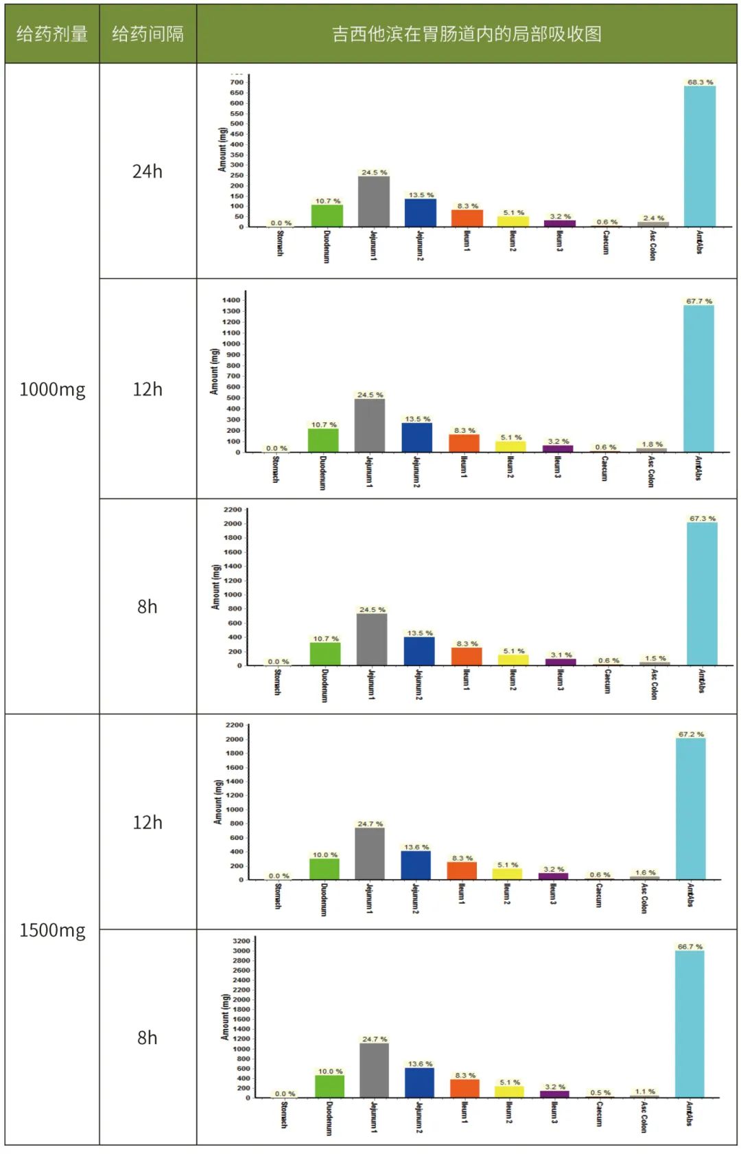 表4 不同給藥方案下口服吉西他濱在胃腸道內(nèi)的局部吸收圖