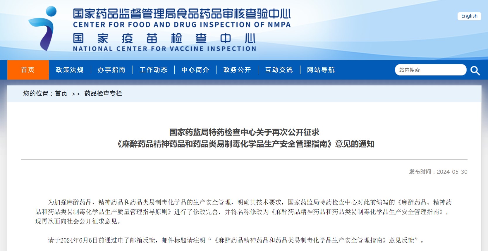 國家藥監(jiān)局特藥檢查中心關(guān)于再次公開征求 《麻醉藥品精神藥品和藥品類易制毒化學(xué)品生產(chǎn)安全管理指南》意見的通知