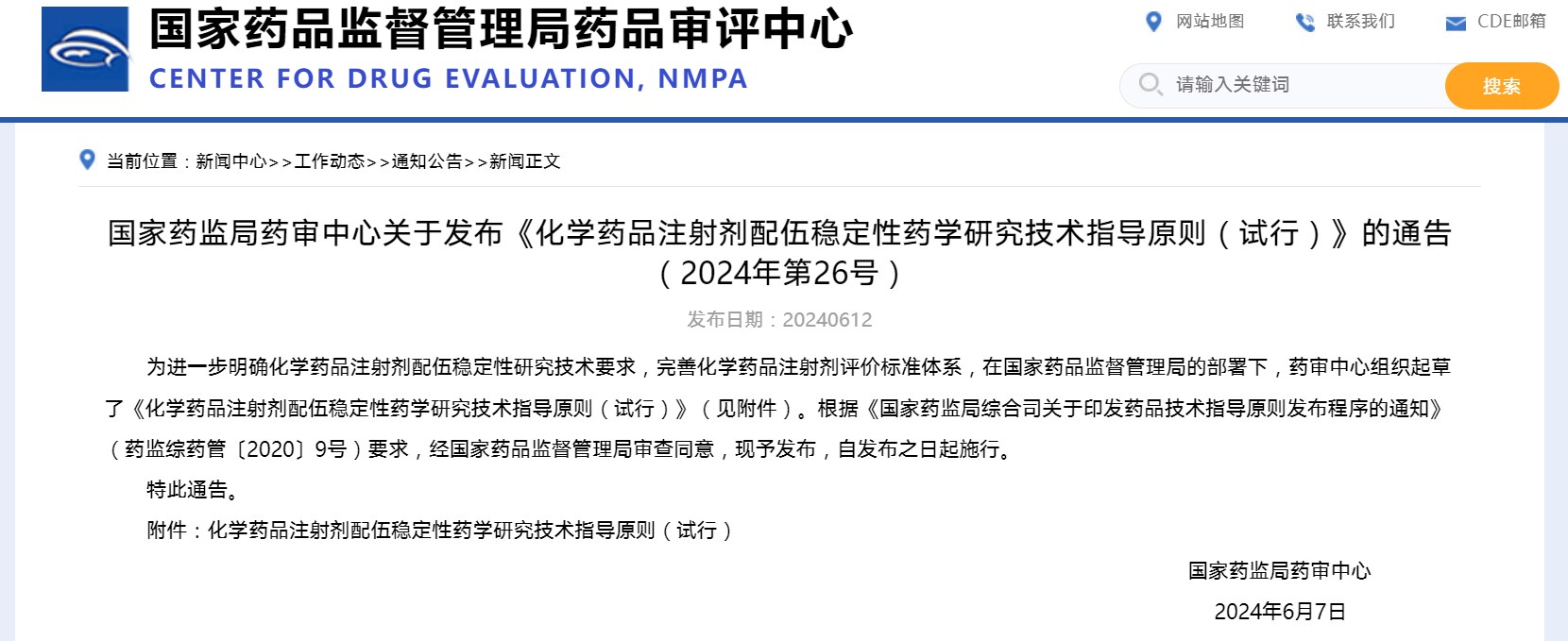 國(guó)家藥監(jiān)局藥審中心關(guān)于發(fā)布《化學(xué)藥品注射劑配伍穩(wěn)定性藥學(xué)研究技術(shù)指導(dǎo)原則(試行)》的通告(2024年第26號(hào))