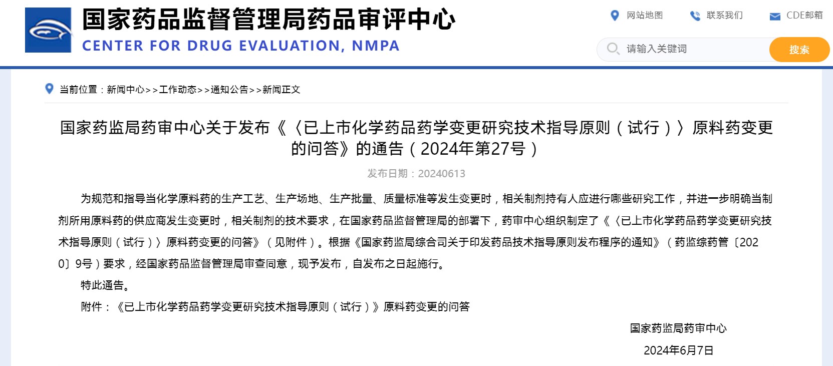國(guó)家藥監(jiān)局藥審中心關(guān)于發(fā)布《〈已上市化學(xué)藥品藥學(xué)變更研究技術(shù)指導(dǎo)原則(試行)〉原料藥變更的問(wèn)答》的通告(2024年第27號(hào))