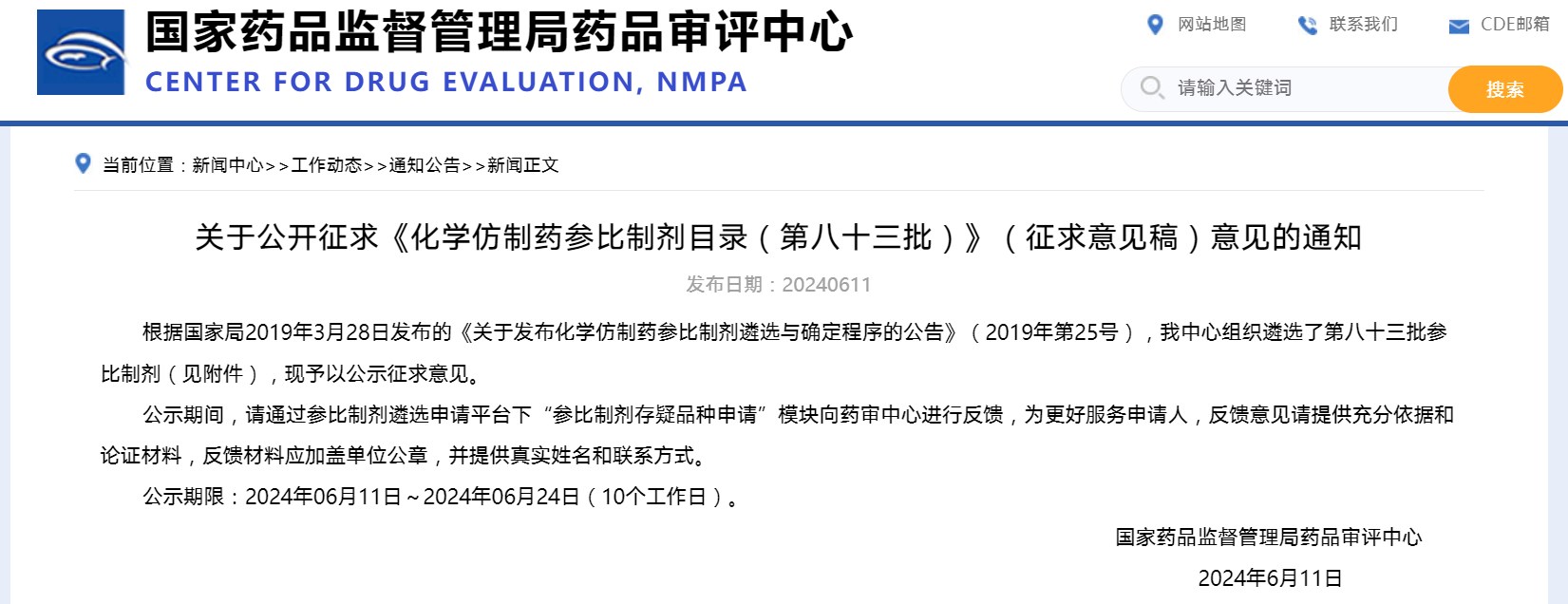 關(guān)于公開征求《化學(xué)仿制藥參比制劑目錄(第八十三批)》(征求意見稿)意見的通知